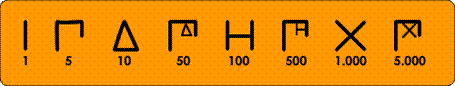 Ι = 1, Π = 5, Δ = 10, Η = 100, Χ = 1000 y Μ = 10000