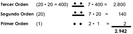 Ahora bien, para escribir números iguales o superiores al 20, las cifras adquirían un valor que dependía de la posición en donde se encontraban, disponiéndose en columnas y asignándose un valor de abajo hacia arriba, en el que hay que multiplicar el valor de cada cifra por 1, 20, 20x20, 20x20x20… según el lugar que ocupe. Por ejemplo: